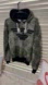 Looks like new hoodie with Emporio Armani logo pattern. Check out the video for details, but the hoodie is made destroyer around the neck. It was purchased just like that. It’s a style. Size it’s medium boy, but small adult could fit in.