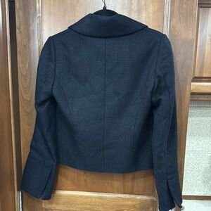 This Emporio Armani blazer in classic black exudes sophistication with its tailored fit and notched lapels. Crafted from a structured fabric, it offers a modern silhouette perfect for formal occasions. The blazer's sleek design ensures a polished and professional appearance.