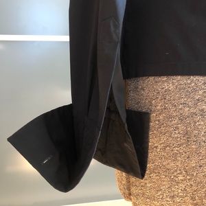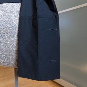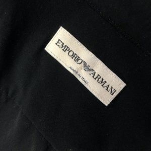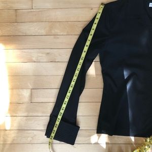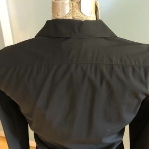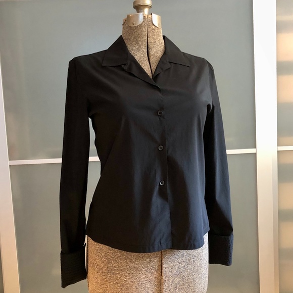 Beautiful black Emporio Armani fitted women's blouse. Classic in style with a few special touches. Sleeves have a double cuff (6 inches/3 inches when folded) with about 10 rows of horizontal stitching and holes for cuff links (not included). Made in Italy, and it shows! Excellent condition.