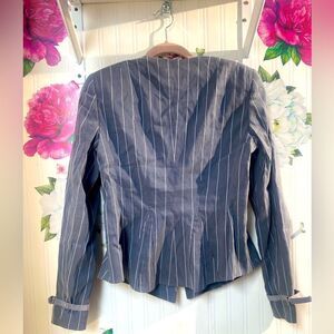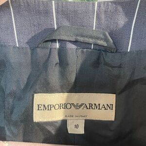 This Emporio Armani blazer showcases a sophisticated gray hue with a striking shawl collar, offering a tailored fit that exudes elegance. Crafted with a subtle striped pattern, it is perfect for adding a touch of refinement to any ensemble. The long sleeves and fitted silhouette make it a versatile addition to your wardrobe.