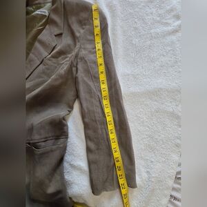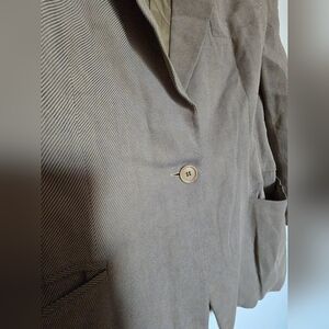 Elegant Tan Jacket. Single-button closure. Classic design. It has a slight bite that is barely noticeable. See Photos for Reference. has details, see the photos carefully.