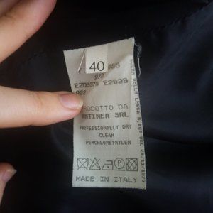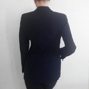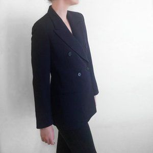 Emporio Armani 100% virgin wool dark navy blue longline double breasted blazer suit jacket with two front pockets and lapel collar.