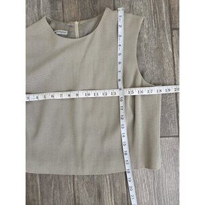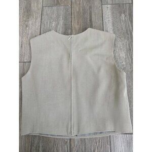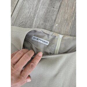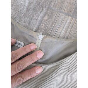 This Emporio Armani Zip Up Wool blend Vest features a striped pattern, sleeveless design, and a crew neckline. The size small vest is made from wool, making it perfect for winter, fall, and spring seasons. The olive color adds a stylish touch to this retro-inspired piece, ideal for women looking to add a touch of 90s flair to their wardrobe.