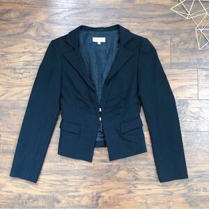 Gorgeous vintage womens tailored blazer jacket by Emporio Armani. Made in Italy. Beautifully tailored style in black wool-blend crepe. Pleating at waist and unique double clasp closure. Fully lined. Bust 34“, waist 27“, back length 19.5“, sleeve length 23.5“. Size 4, excellent preowned condition.