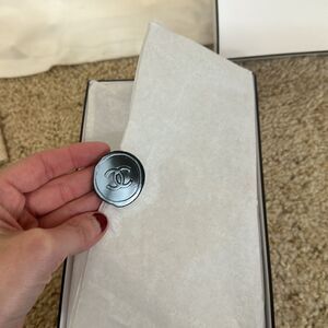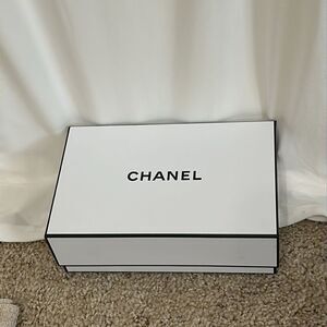 Empty Chanel box with original elastic ribbon, tissue paper with sticker and packaging paper strips.