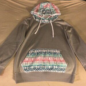 Grey pullover hoodie with colorful aztec pattern