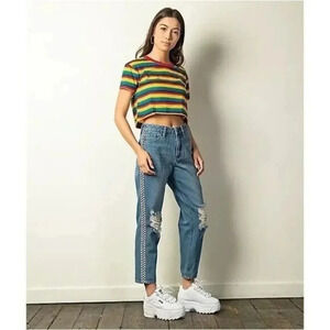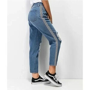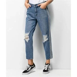 Empyre Eileen Checkered Side Stripe Light Wash Distressed Straight Leg Jeans 4