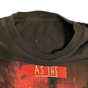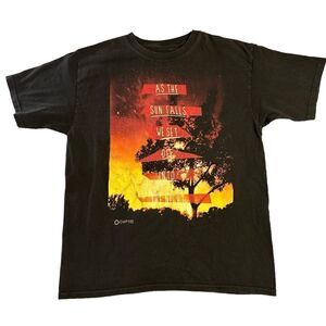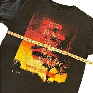 Empyre (Zumiez) Festival Skater Street ware graphic short sleeve T-shirt - Size Large. “As the sun falls we set off into the night” caption with Forest sunset background. T-shirt has a cracked effect on the print and is suitably worn enough to make it softer and slightly faded.