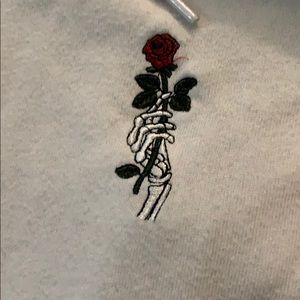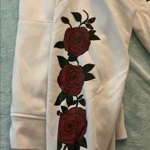 Super comfy sweatshirt with rose detailing on the sleeves and and embroidered patch in pocket area.