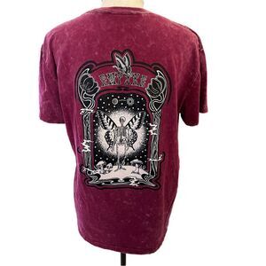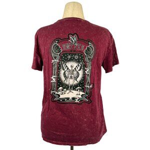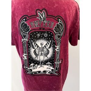 Trippy and darkly whimsical—this red acid wash Empyre tee features a framed back graphic of a butterfly-winged skeleton fairy surrounded by mushrooms. Small matching graphic on the front. Soft cotton, relaxed fit, and a killer piece for goth, alt, or festival styling.
