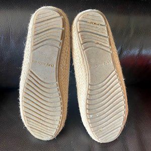 Lace up sneaker ivory, beige laces, jute trim around soles. Look excellent! Only signs of use or wear is slight residue/marks on bottom soles.