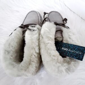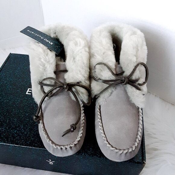 brand new in box. Emu australia burra women winter shoes size 5M gray color suede. pet and smoke free home.