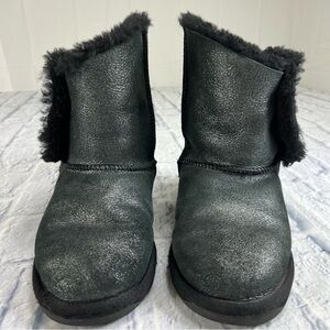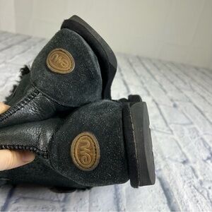 Great preowned condition emu Australia sheepskin boots. Black/ dark grey silver sheen boot with leather and interior sheepskin. Size 9 women's or size 8 men's. Minor wear on the back bottom of the shoe otherwise excellent preowned condition. This comes from a smoke free home and will be mailed same business day.