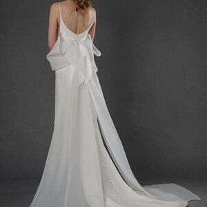 Chic, sleek, and effortlessly elegant — the Emyrson gown is the epitome of modern sophistication. Featuring a graceful cowl neckline with delicate spaghetti straps, this fitted silhouette is designed to flatter with soft draping and a daring side slit. The back stuns with a dramatic oversized bow and flowing train, finished with a trail of covered buttons for timeless detail. Perfect for the bride who wants a minimalist look with unforgettable impact.