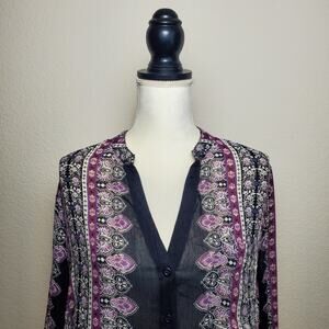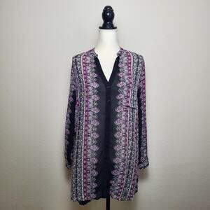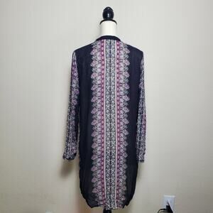 Effortlessly chic, this shirtdress features a gorgeous multicolor bohemian print. The long sleeves and rounded hem add a flowy, feminine touch, making it an easy transition from desk to dinner. Style it with boots for a casual vibe or heels for a polished look!