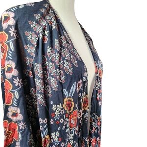 Elegant flowy kimono with dark floral design. Features intricate patterns.