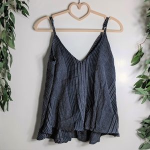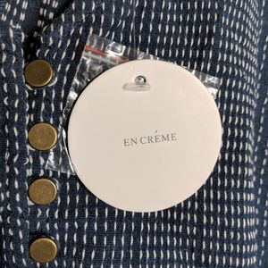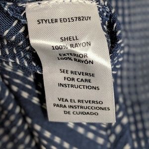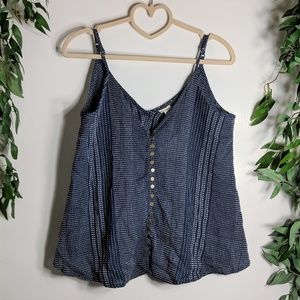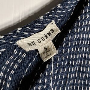 Trendy blue and white embroidered fabric tank by En Creme (sold by companies like Bloomingdale's and Asos). New with tags, no flaws. Features adjustable straps and brass button front closures. Oversized but no stretch to fabric so please see measurements below.