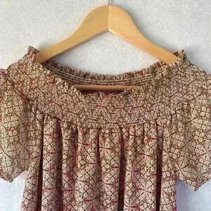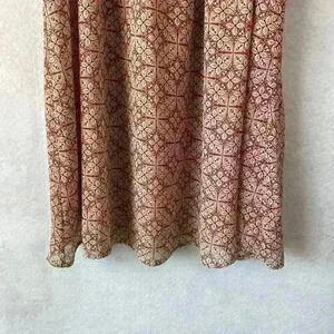 En Creme Red White Abstract Smocked Collar Flowy Sleeve Blouse Size Small