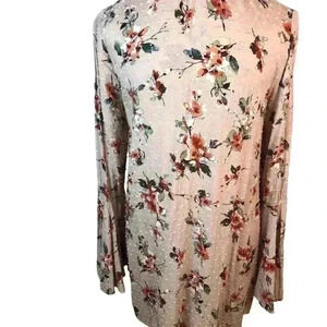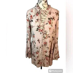 En Creme Women’s Small Dusty Pink Floral Swiss Dot Blouse Tie Front Bell L/S