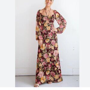 Boho floral maxi dress, En Crème dress, burgundy floral gown, cutout halter maxi, long sleeve fall dress, bohemian floral dress, festival dress, romantic floral print dress, holiday party dress, square neckline dress, En Crème women’s clothing, new with tags maxi, free people style floral dress, Anthropologie style maxi dress