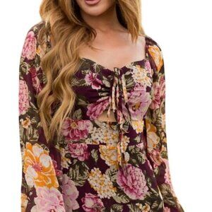 Romantic and effortlessly chic, this En Crème floral maxi dress features a stunning burgundy base with pink, yellow, and green floral prints. Designed with a square neckline, front cutout detail, and convertible halter tie that can be worn two ways — tied in front or around the neck. The balloon long sleeves have elastic shoulders and cuffs for comfort and a flattering fit.