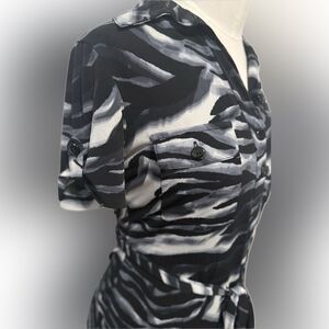 Step out in style with this black and gray patterned dress. Perfect for any occasion, this dress offers a sophisticated look with its unique design.