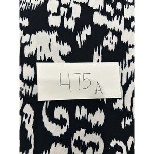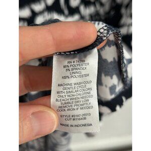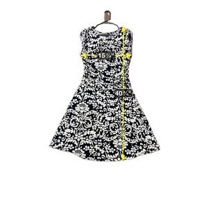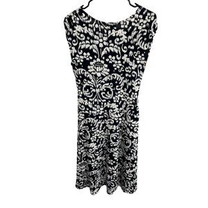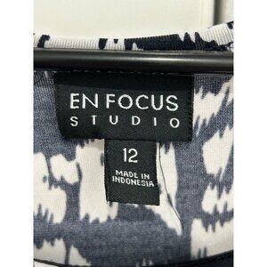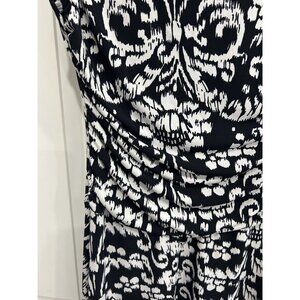 black dress, white pattern dress, ruched waist dress, sleeveless dress, En Focus Studio dress, polyester spandex dress, size 12 dress, women's patterned dress, black and white dress, formal dress, knee-length dress, stylish dress, comfortable women's