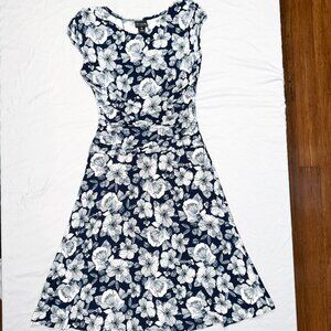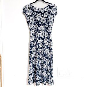 Beautiful navy blue and white floral print cap sleeved midi dress with a drop waist and ruching detail. Classic flowy a-line dress that is comfortable, has lots of stretch, and sways with grace when you walk. Pull over styling. Can be dressed up or dressed down. Layer with a cardigan for an elegant touch! Excellent pre-loved condition. Measurements in photos.