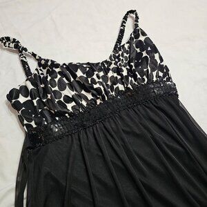 As the evening sun dips below the horizon, this elegant dress tells a story of effortless grace. Its flowing black chiffon cascades like a midnight waterfall, while the bold black-and-white patterned bodice adds a playful contrast. The handkerchief hem sways with every step, making it an enchanting choice for twilight adventures and moonlit dances.