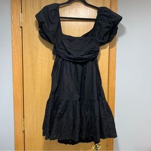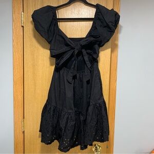 This elegant black dress features stylish puff sleeves and intricate detailing. Perfect for any occasion, it offers a sophisticated look with a comfortable fit. It has a bow on the back as well as an eyelet pattern on the bottom.