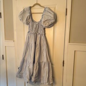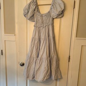 Charming light blue dress with puff sleeves. Features a tiered design. Perfect for casual outings. *this dress does not have the strings on it