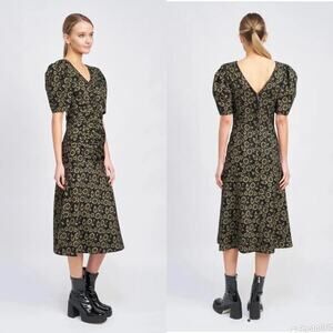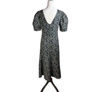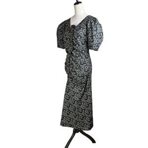 En Saison NWT Black Denim Floral Print Ruffle Puff Sleeve Fit & Flare Midi Dress