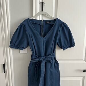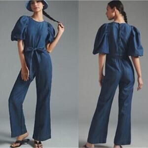En Saison Puff Sleeve Belted Denim Wide Leg Jumpsuit Medium