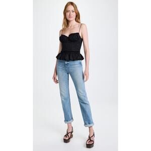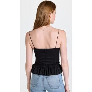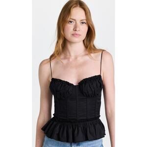 This cropped top is made from lightweight, non-stretch poplin and features a sweetheart neckline with underwire cups, a boned corset-style bodice, ruffle trim, and elastic shoulder straps. It has a hidden zip at the back, is lined for comfort, and is crafted from 85% lyocell and 15% linen with a 100% polyester lining.