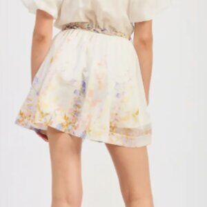 A floral placement print blossoms along the hem of this airy minidress hugged by a braided tie belt.
