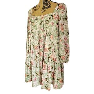 En Saison tiered mini dress, featuring a square neckline and long sleeves. The dress is designed with a tiered silhouette, creating a flowy and relaxed fit. It is adorned with a floral pattern in shades of pink and green against a light background. Lightweight fabric suitable for spring or summer wear.