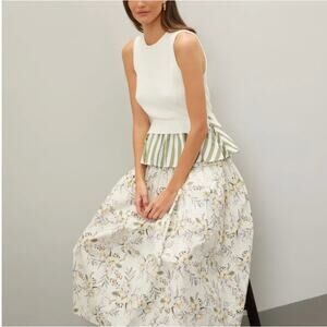 White with stripe print (80% Rayon, 20% Nylon; Lining: 95% Rayon, 5% Spandex). Top. Sleeveless. Crew neck. Pull-on closure. Coastal, preppy, quiet luxury vibes
