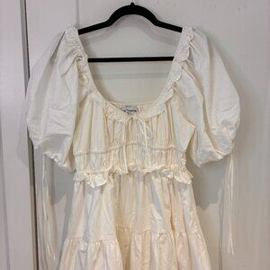 Elegant poplin white midi dress by En Saison. Features puff sleeves and a tiered skirt. Perfect for any occasion. Size small but would fit anyone small/medium.
