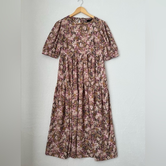En Saison Women Pink Brown Jocelyn Floral Midi Dress Open Back Tiered Size Small