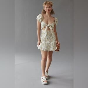 This floral eyelet minidress from En Saison features a front cut out with a tie detail at the center bodice. The style is finished with puff cap sleeves