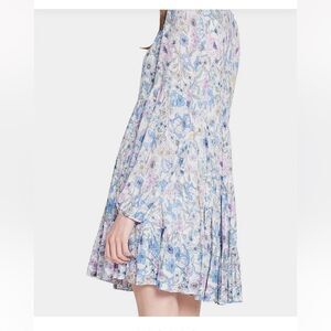 This long-sleeve mini dress, cut in an A-line silhouette with a scoopneck and tiered skirt, is finished with fresh floral prints for a breezy look.