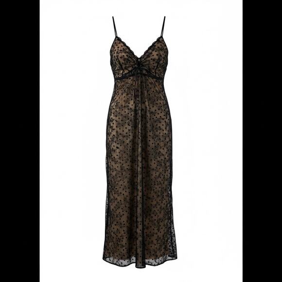 En crème Boutique Lace Overlay Long Dress W/ Keyhole Nude Black Spaghetti Strap