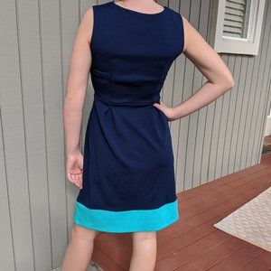 Enfocus Studio Navy Blue / Teal Color-Blocked Dress. Box Pleats at Gathered Waist, subte flounce skirt. Crew Neck, Sleeveless. Very Flattering