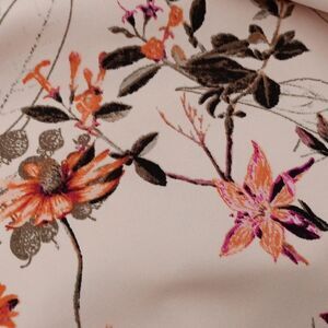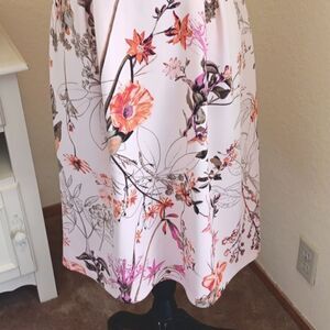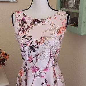 Pretty floral dress with Asian inspired graphics. Princess seams. Back V. Top lined. Pull over style. Size 6 measures 36 at waist, 30 at waist, full skirt . 41 long from shoulder to hem. A lovely dress for work or after.
