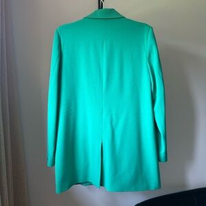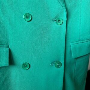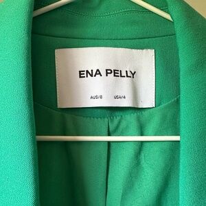 Front button closure. Padded shoulders. Front flap pockets. Buttoned cuffs. Back vent. Made in Australia.