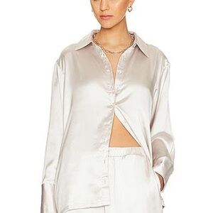 Elegant white button down shirt. Satin finish. Long sleeves with button cuffs. Classic collar.