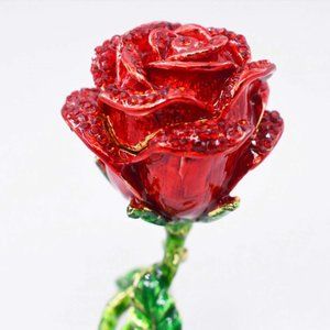 Enamel & Austrian Crystal Rose Ring Gift Box. Handpainted Enamel with Austrian Crystals. Sits upright on carefully painted enamel stemps. Magnetic clasp on lid. 3.5" tall x 3" x 2". Absolutely exquisit! Perfect way to surprise her with that proposal. Beautiful way to keep that special ring safe when not wearing it.