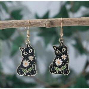 Enamel Black Cat Shaped Earrings Daisies Flowers Dangle