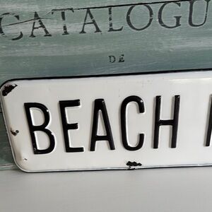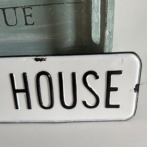 Charming 'Beach House' sign. Black text on white background. Perfect for coastal decor. Has hardware for hanging.