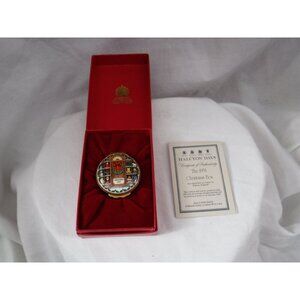 Halcyon Days Enamels Christmas 1991 Trinket Box. The enamel box has a scene of a door decorated for Christmas, with a wreath and presents. "Christmas 1991. is on the door." The site has many presents. It has a diameter of 1.6" with a height of 1". On the bottom is: "Designed by Halcyon Days - London - Made in England". It comes in the original box with a certificate of authenticity pamphlet and is in excellent condition.